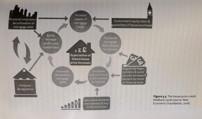 The thing with positive feedback cycles is that they necessarily come to an end, unless there is some enormous reservoir of resources they can draw from in order to keep perpetuating. In the housing market, the basic mechanic through which this keeps perpetuating is: banks lend money to homebuyers; the more freely they lend it, the higher it will drive house prices. This has two mutually reinforcing consequences: people will need bigger mortgages, and the bank will be able to issue them, since they’re allowed to lend up to a specific leverage ratio that is now buoyed by rising home values. There are many more ingredients to this cycle (see the diagram below), but that’s the basic idea.”